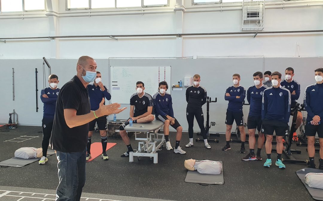 Miembros de la primera plantilla de Osasuna escuchan con atención las explicaciones de Diego Reyero. Los jugadores han podido prácticar las maniobras de reanimación y desobstrucción de la vía aérea. En próximas fechas se repetirá la formación con el primer equipo...